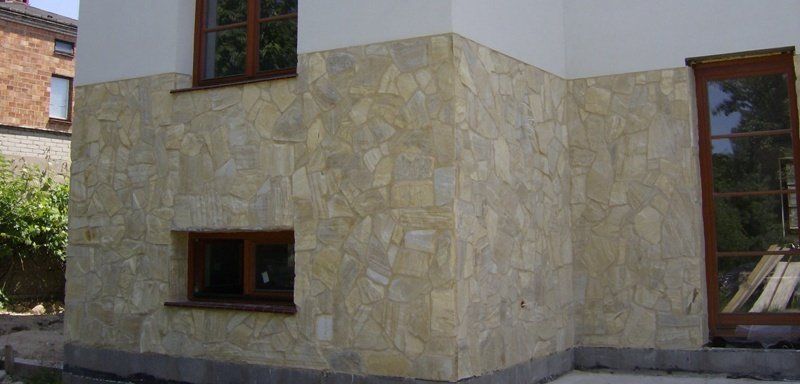 Quarzit-Bruchstein mit einer Stärke von 20 - 30 mm. Ein Farbmix aus Gelb und Creme.