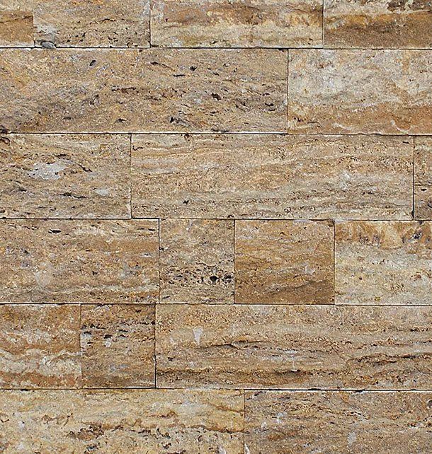 Hell bis dunkelgoldfarbene Fliesen. Die Höhe ist 70 mm, die Länge variiert und die durchschnittliche Stärke beträgt 20 mm. Andere prüfen Steinwandfliesen.